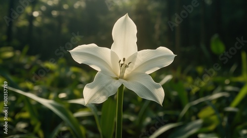 © Biancaart, Obraz premium White Flower Blooming in a Lush Green Garden, Sunlight Filtering Through Trees
