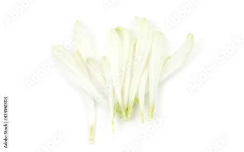 Naklejka premium White flower petal on empty white background with copy space . Light and...