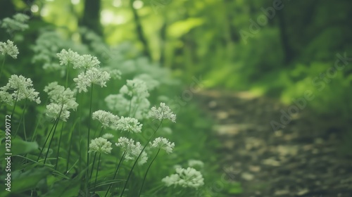 © Yopi, Fototapeta premium White Flowers Along Forest Path Soft Light and Green Foliage