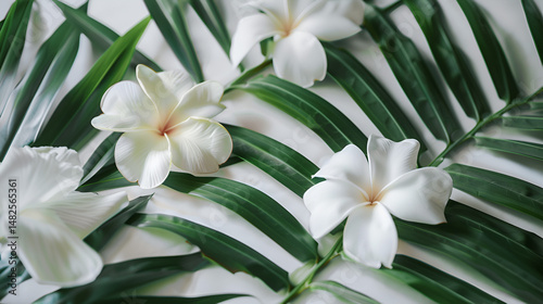 Obraz premium White flowers and green leaves arranged on a white surface creating a natural...