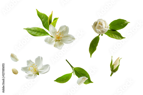 Fototapeta premium White flowers and green leaves isolated on white