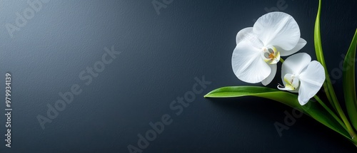 © Viktor, Obraz premium White flowers atop green foliage plant against dark blue backdrop
