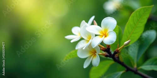 Fototapeta premium White flowers blooming on a single plumeria tree branch, tree, greenery