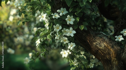 © bulegendut, Obraz premium White flowers blooming on a tree trunk.