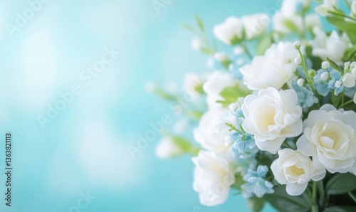 © Endin, Fototapeta premium White flowers bouquet soft aqua background