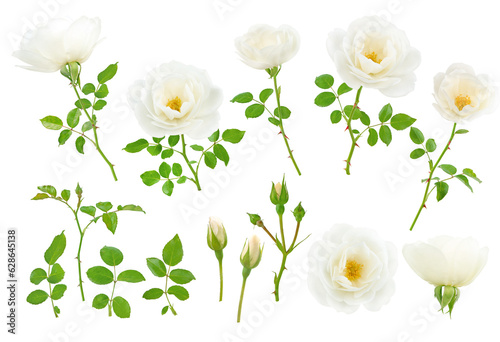 Obraz premium White flowers, buds, leaves and branches set isolated transparent png
