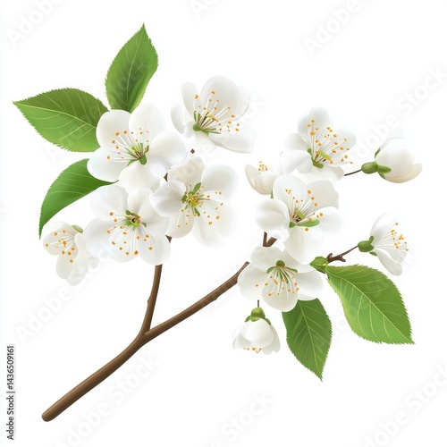 © Ahmads, Obraz premium White flowers, cherry blossom branch with leaves on a white background,