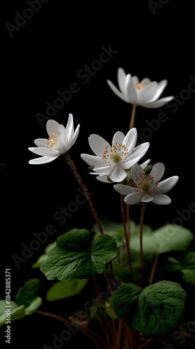 Obraz premium White flowers grow from green leaves in a dark background in this close-up...