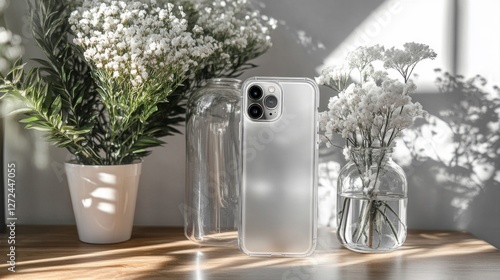 Fototapeta premium White Flowers in Clear Vases and Smartphone with a Transparent Case on Table