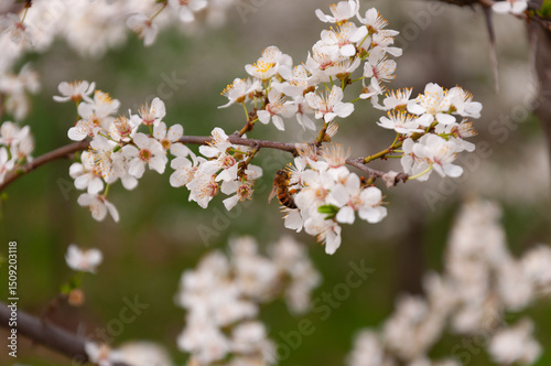 Obraz premium white flowers of fruit trees with bee on it in spring garden