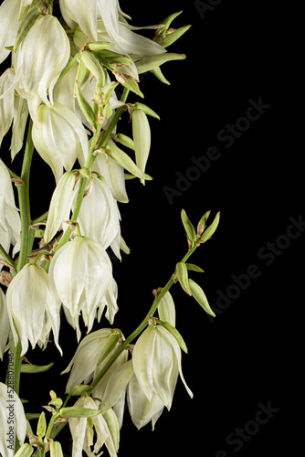 © kostiuchenko, Obraz premium White flowers of yucca, isolated on black background