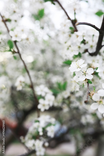 © alexkich, Fototapeta premium White flowers on a green bush. The white rose is blooming. Spring cherry apple blossom.