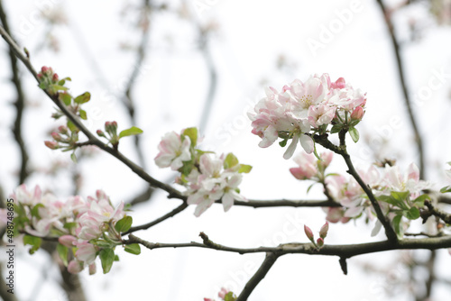 © Olesia Prokoshina, Obraz premium White flowers on branch of cherry tree in blossom on spring.