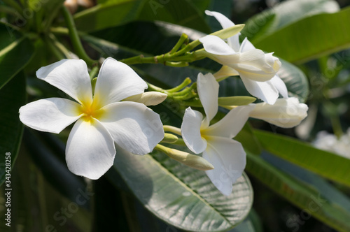 © peerayot, Fototapeta premium White flowers with green leaf in park.