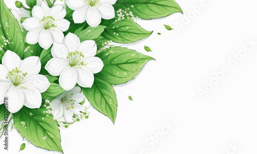 © Андрей К, Fototapeta premium White flowers with green leaves on a white background with space for text_2