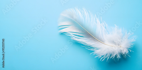 Fototapeta premium White fluffy bird feather on sky blue background