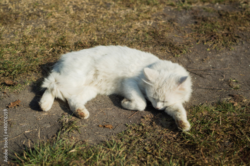 Fototapeta premium White fluffy cat basks on the path in the sunlight