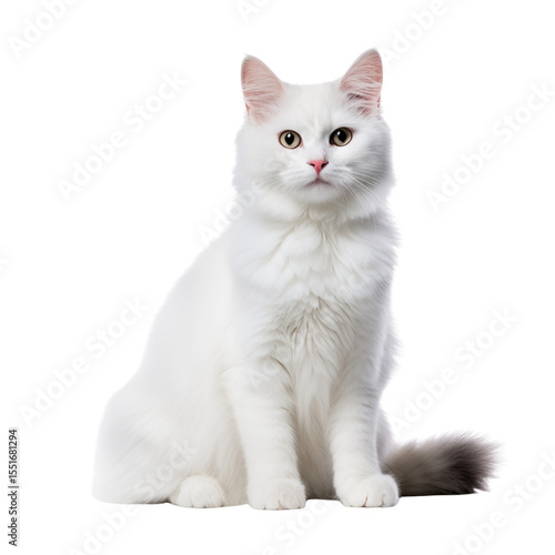 Fototapeta premium White fluffy cat sitting calmly on a white background
