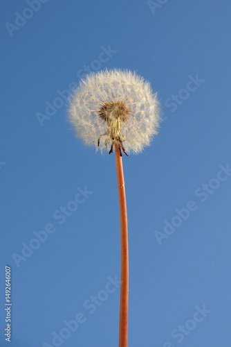 Fototapeta premium White fluffy dandelion seed head against a blue sky