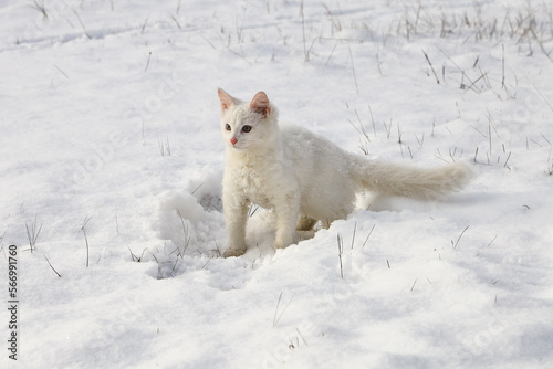 Fototapeta premium White fluffy kitten in snow on field on sunny day