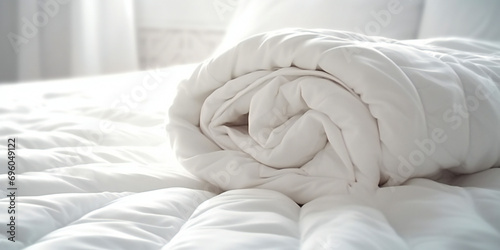 Obraz premium White folded duvet lying on white bed background. Preparing for winter season, household, domestic activities, hotel or home textile