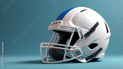 © Get it, Fototapeta premium White football helmet with black face mask and brown football suitable for sportsthemed designs, sports blogs, social media posts, and athletic events promotions.
