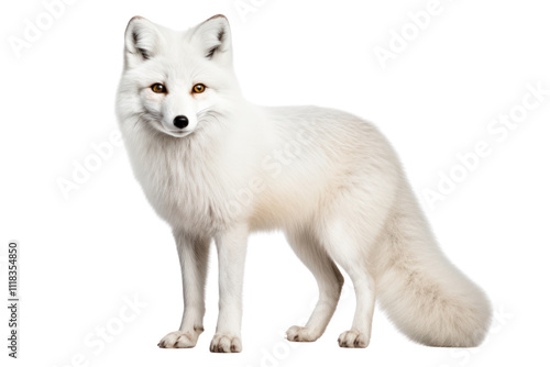 © Oratai, Fototapeta premium White fox standing alert with its fur glistening, capturing its keen gaze and detailed texture, isolated on white background