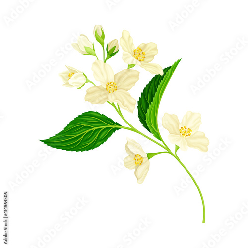 © Happypictures, Obraz premium White Fragrant Jasmine Flowers on Stem with Green Leaves Closeup View Vector Illustration