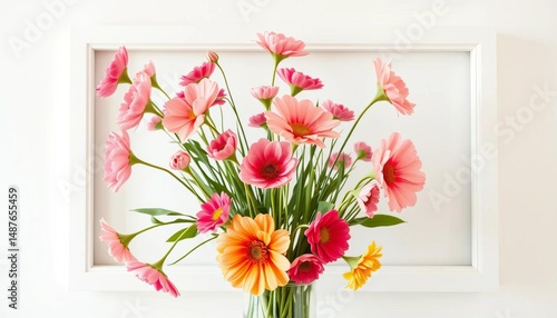© chanwut, Obraz premium White frame mockup showcasing spring flowers in a vase on a light background, ideal for interior design, springtime, bright