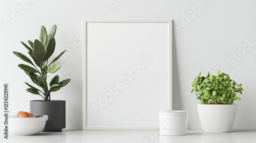 Fototapeta premium White Frame Mockup with Potted Plants on White Table