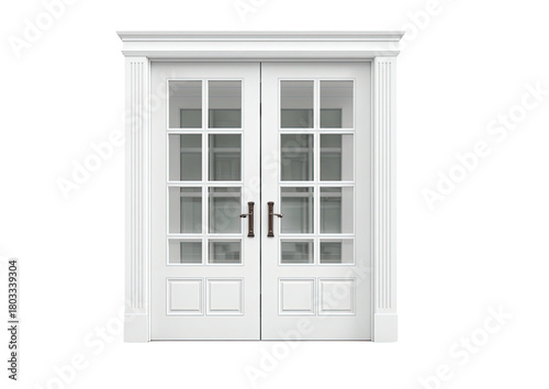 © berindo, Fototapeta premium White framed, paneled glass double doors on black background