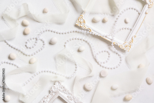 Obraz premium White frames, pearls, pebbles and silk ribbons top view on a white table