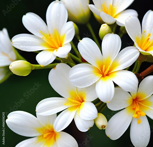 © Watcharakorn, Naklejka premium white frangipani flowers, nature, white, tropical, blossom, plant, beauty, yellow, spa, flowers, spring, flora, bloom, hawaii