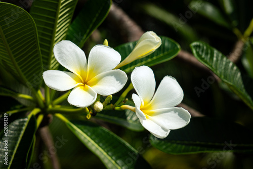 Fototapeta premium White Frangipani flowers on bunch of tree,sunlight ray.