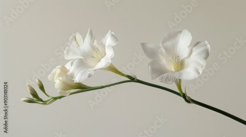 © Penatic Studio, Obraz premium White Freesia Flower with Buds and Stem on a Light Background