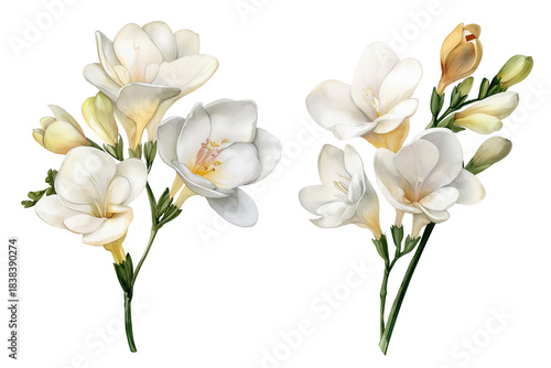 © Prazis Images, Obraz premium White Freesia Flowers Hand Drawn Watercolor Flowers Illustration