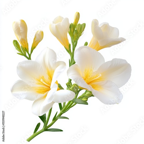 © idharmaian, Fototapeta premium White freesia flowers with yellow centers isolated on white background.