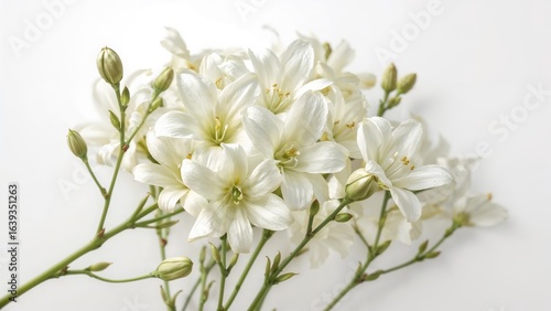 Obraz premium White freesias and their blossoms against a pale backdrop