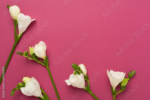 © Liami, Fototapeta premium White fresia flower on color background, top view