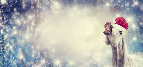 Fototapeta premium White funny Christmas horse with Santa hat smiling and looking into camera