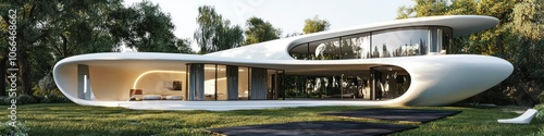 Obraz premium White futuristic home with charcoal wool rugs and a large yard.