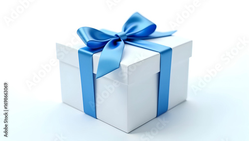 © VectorArt, Obraz premium White gift box tied with blue ribbon on clean background