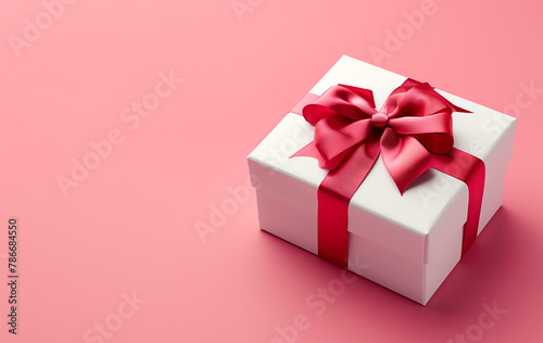 © ELENA AI, Obraz premium White gift box with a red bow on a pink background. View from above. Place for congratulatory text