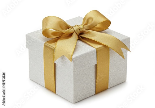 © Vooglo.com, Obraz premium White gift box with golden ribbon and bow isolated on white background