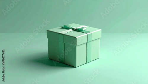 © Muji Creatives, Obraz premium White gift box with mint ribbon and pink rose on green background