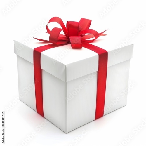 © dony, Fototapeta premium White gift box with red ribbon bow, isolated on white background