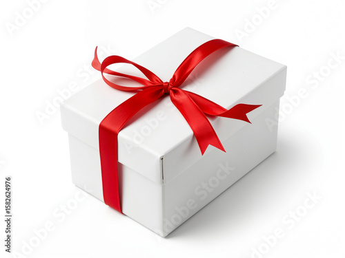 © Ksenplus, Fototapeta premium White gift box with red ribbon on a plain background