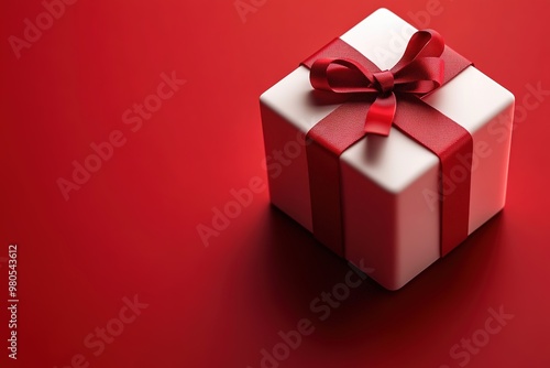 © Larisa, Fototapeta premium White gift box with red ribbon on red background