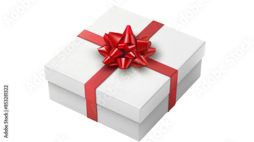 © PerfectPhoto, Fototapeta premium White gift box with red ribbon on white background