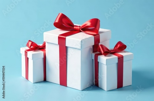 Fototapeta premium white gift boxes with red satin ribbon on blue background